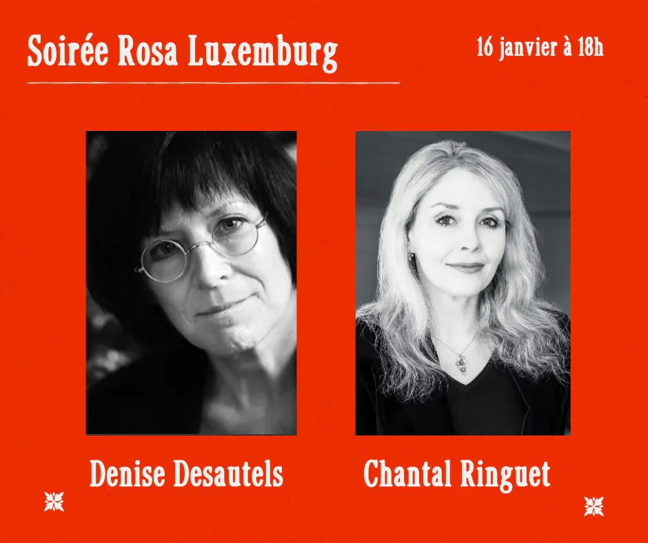 "Ceux qui ne bougent pas ne remarquent pas leur chaînes " écrit la philosophe politique Rosa Luxemburg. Pour marquer le coup de l'anniversaire de son assassinat et pour nous inspirer pendant cette période de hautes turbulences, vous êtes invités à venir écouter de grandes écrivaines: Diane Régimbald, Denise Desautels, Louise Dupré, Chantal Ringuet, Marie-Célie Agnant, Nora Atalla, Nadine Ltaif, et Caroline Louisseize.